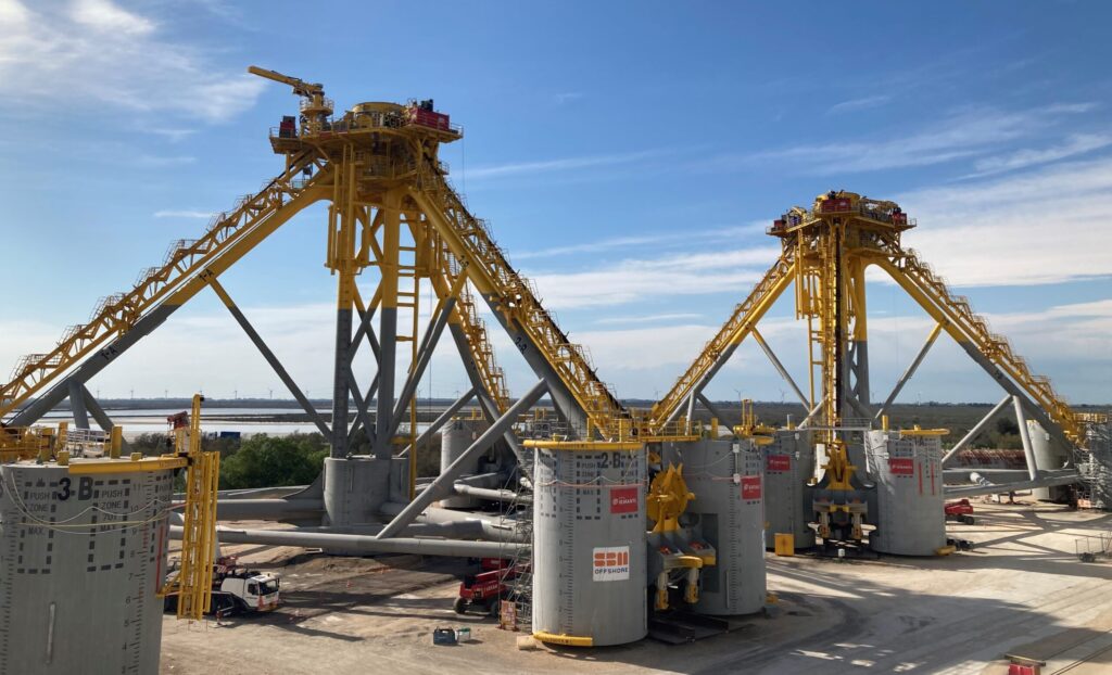 L’assemblage des flotteurs sur le chantier Eiffage Métal à Fos-sur-Mer est terminé. Ils vont maintenant être mis à l’eau via l’utilisation d’une barge submersible qui sera coulée dans la darse 1 du port de Marseille-Fos. Une fois mis en flottaison, ils seront successivement tractés jusqu’au quai Gloria pour la phase d’intégration des éoliennes (voir ci-après).