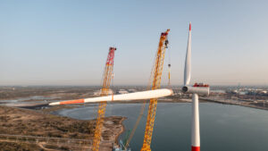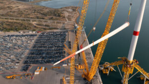 Cette première éolienne va désormais être remorquée jusqu’au quai Graveleau afin d’être stockée et contrôlée avant son départ en mer. En parallèle, la deuxième puis la troisième éolienne vont être assemblées sur leur flotteur respectif sur le quai Gloria.